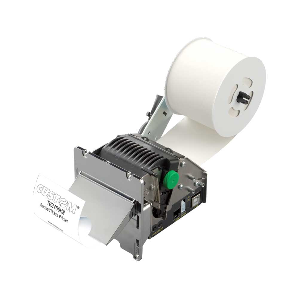 • Dispenser de billetes de 60 mm con sistema tear off patentado (sin autocutter) y boca cromada resistente a hidrocarburos que convierte a la impresora en ideal para las gasolineras